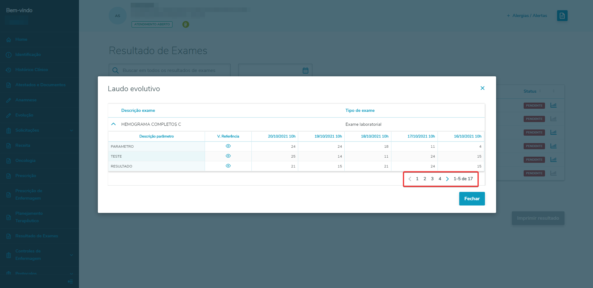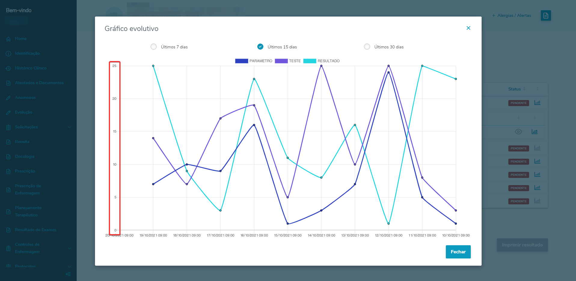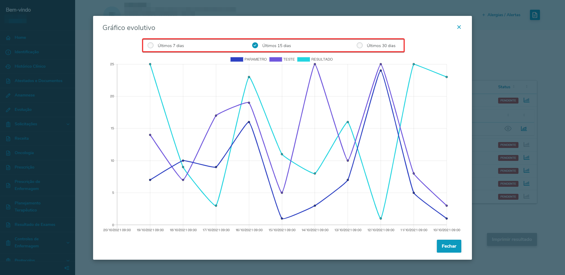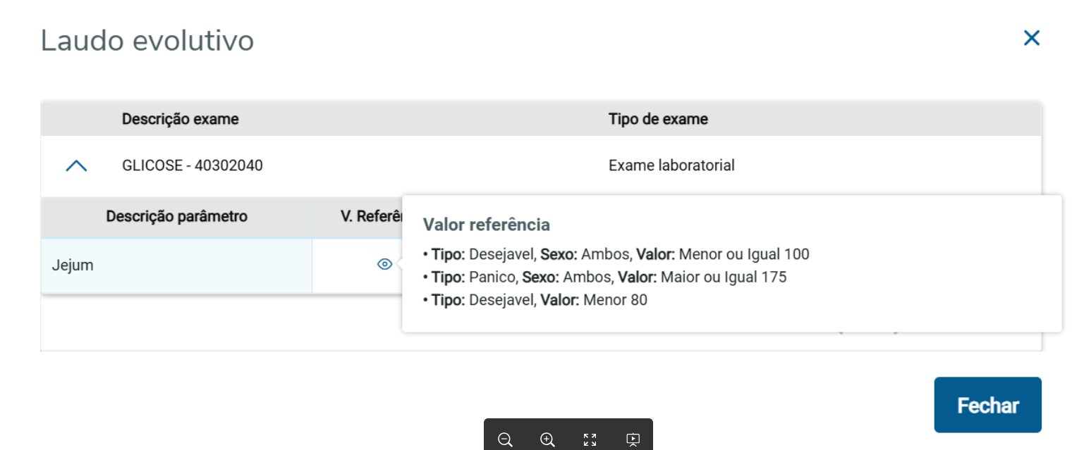 Será aberto um modal e exibido um gráfico daquele exame com todos parâmetros seguidos dos resultados anteriores classificados por data.