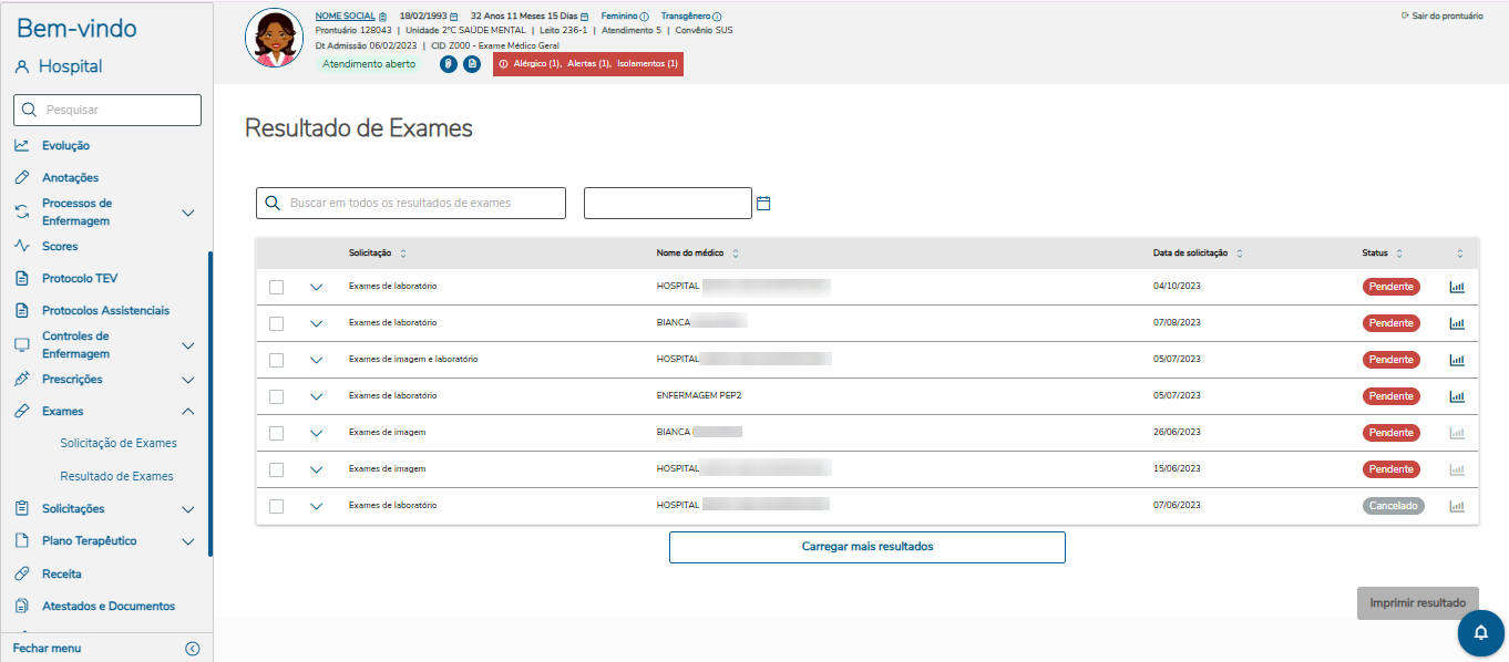 Esta tela tem como objetivo visualizar todos os status e resultados dos exames que foram realizados pela unidade diagnóstica da própria instituição. Desta forma a lista de exames visualizada aqui não será necessariamente a mesma contida na tela de Solicitação de exames.
