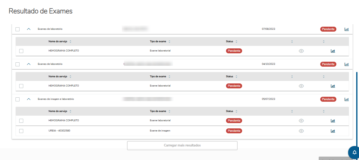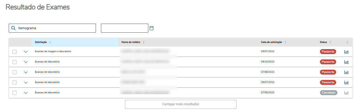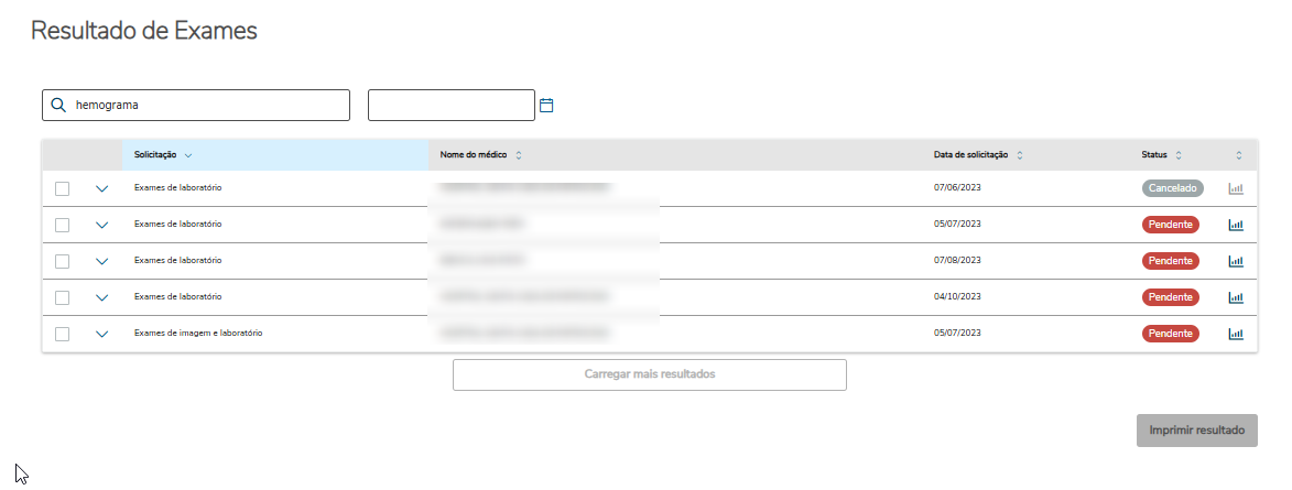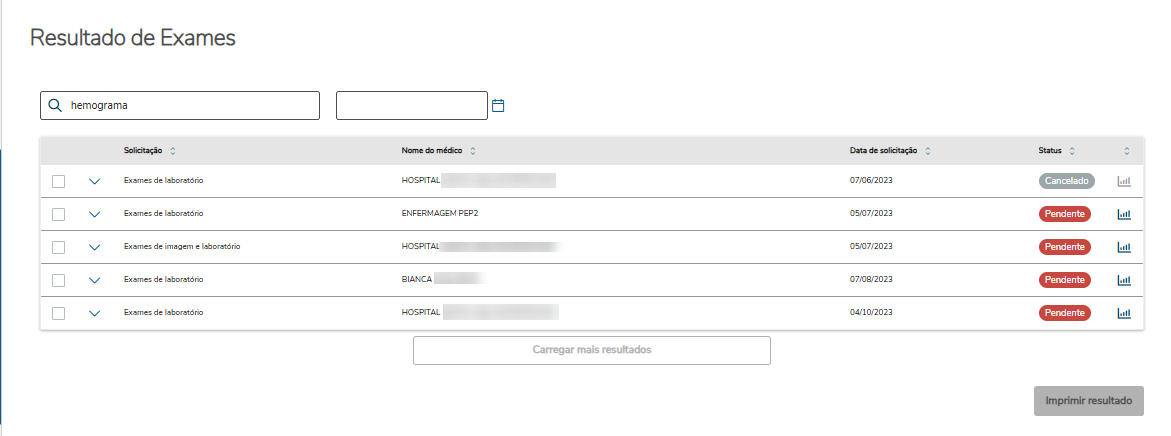 • Status: que poderá ser pendente, reconvocação ou liberado. O valor será liberado apenas quando todos os exames da solicitação estiver com status liberado.