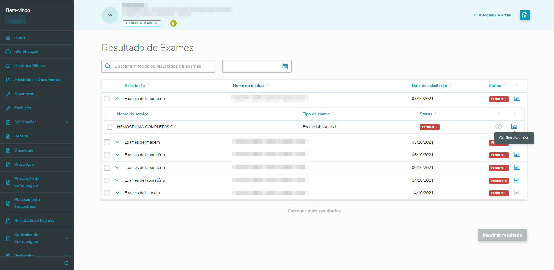 Na tela de resultados de exames, ao escolher uma solicitação de exames, expandir e em seguida, clicar em gráfico evolutivo.
