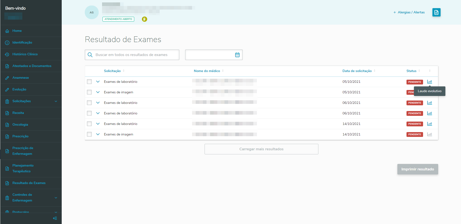 • Laudo evolutivo: deverá exibir um botão habilitado que permitirá a visualização do laudo evolutivo quando for exame de laboratório. Quando for exame de imagem o botão deve estar desabilitado.