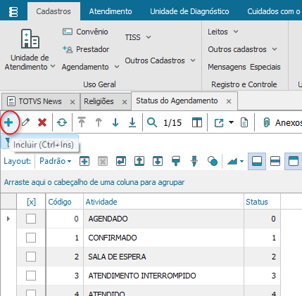 No TOTVS Gestão Hospitalar acesse Cadastros> Uso geral> Agendamento> Status de Agendamento.