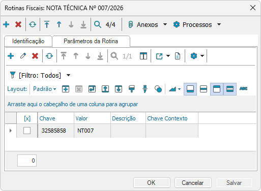 Em seguida no anexo "Parâmetros da Rotina" é necessário cadastrar um novo informando o código IBGE do município no campo chave e o texto NT007 no campo valor.