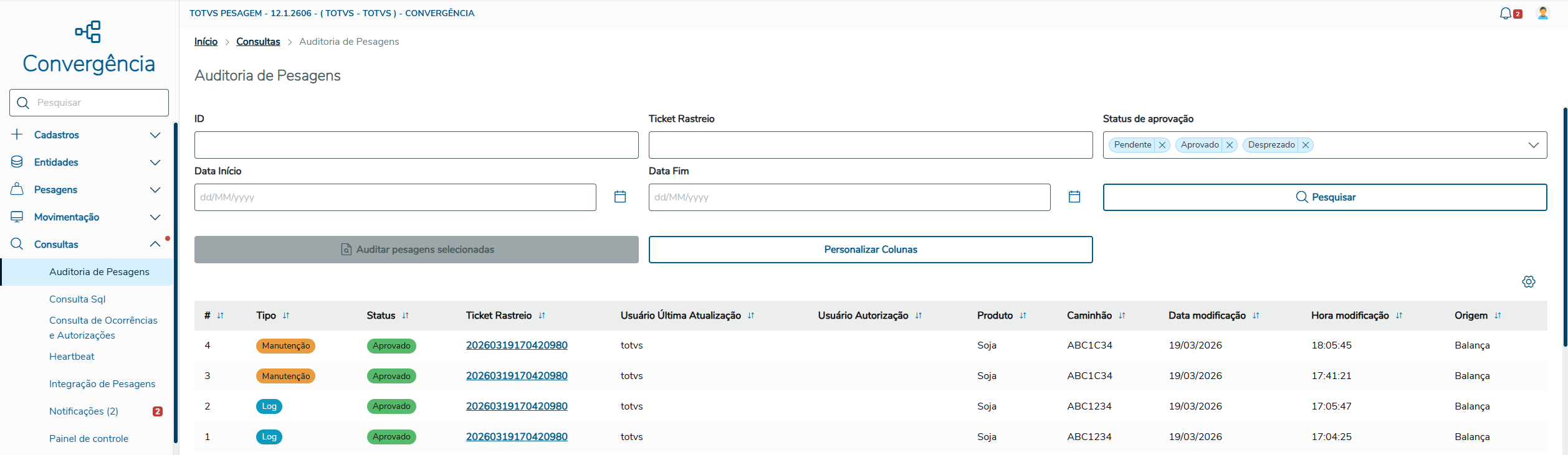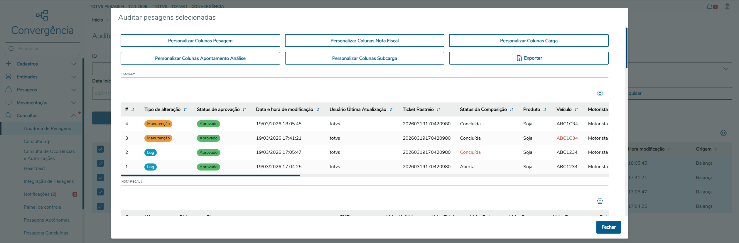 - Tela Auditoria de Pesagens