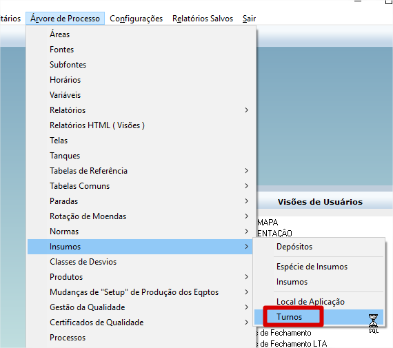 Para cadastrar os turnos deve entrar em arvore de processo > insumos > turnos.