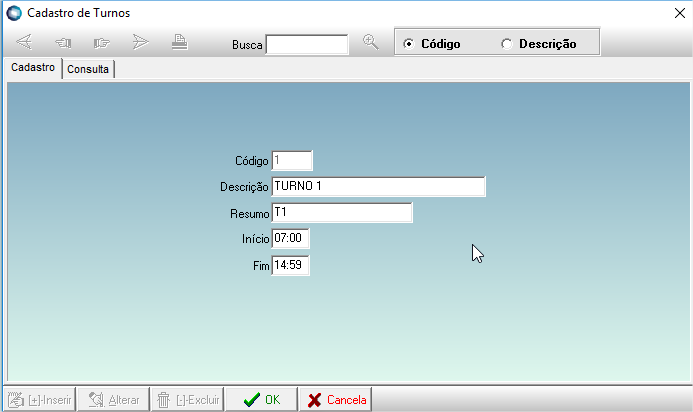 Cadastro de turnos serão utilizados no momento da digitação de seus consumos.