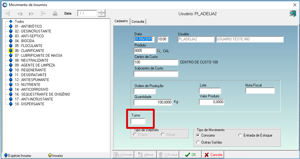 Digitação do turno no movimento de digitação de consumo de insumos: