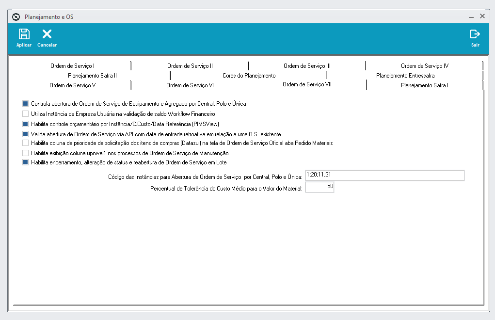 Objetivo: Parametrizar o sistema, habilitando ou desabilitando opções de funcionalidades e validações de dados focando os planejamentos de safra, entressafra e ordem de serviço.