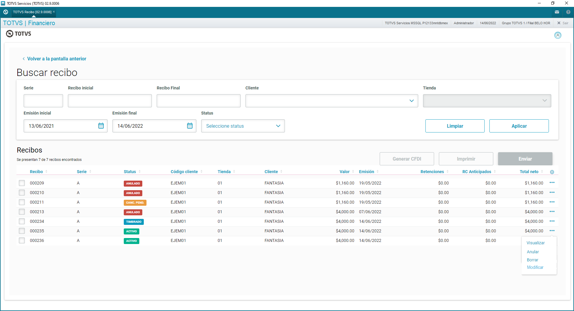 La ventana de buscar recibo de Totvs Recibo tiene la funcionalidad de buscar los recibos de acuerdo con los datos ingresados en los respectivos filtros: