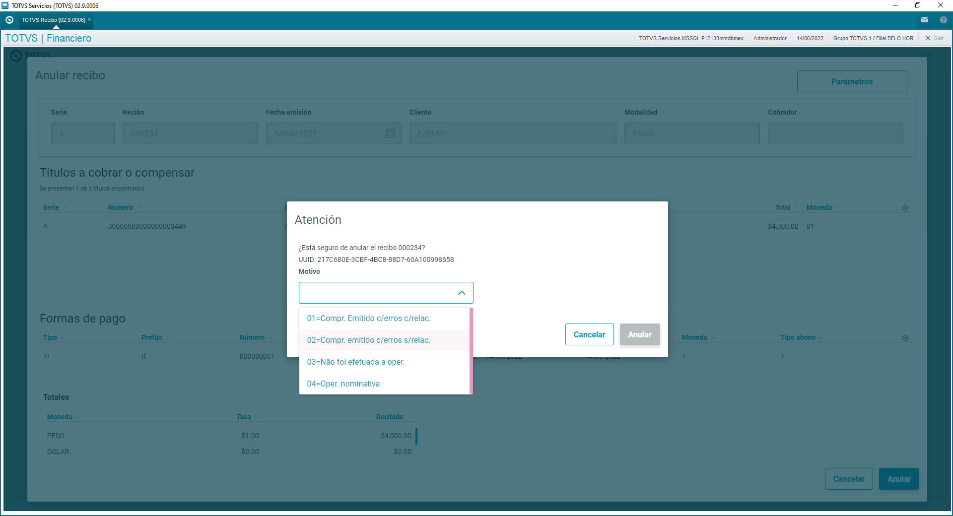 En caso de no configurar el grupo de preguntas "FIN998A", serán mostradas por default el grupo de preguntas "FIN998" en la opción Modificar Recibo de TOTVS Recibo.