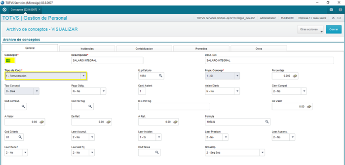 Los conceptos de tipo Remuneración deberán tener informado la cuenta de Cargo y/o Abono