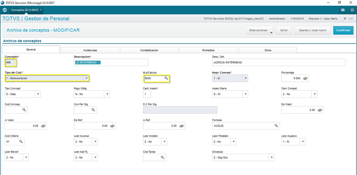 | S6 | NOVEDAD LIC. MATERNIDAD O PATERNIDAD | No | |