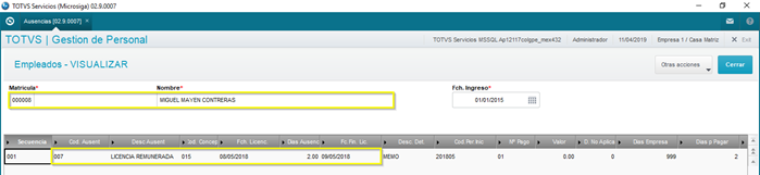 Para el empleado 000008 – Mayen Contreras Miguel, tuvo una ausencia por permiso de licencia no remunerada por 2 días.