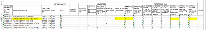 El empleado 000007 – Ibarra Ibarra Jaime, tuvo una incapacidad por licencia de Paternidad por 8 días por lo que el registro en el archivo UGPP queda como se indica:
