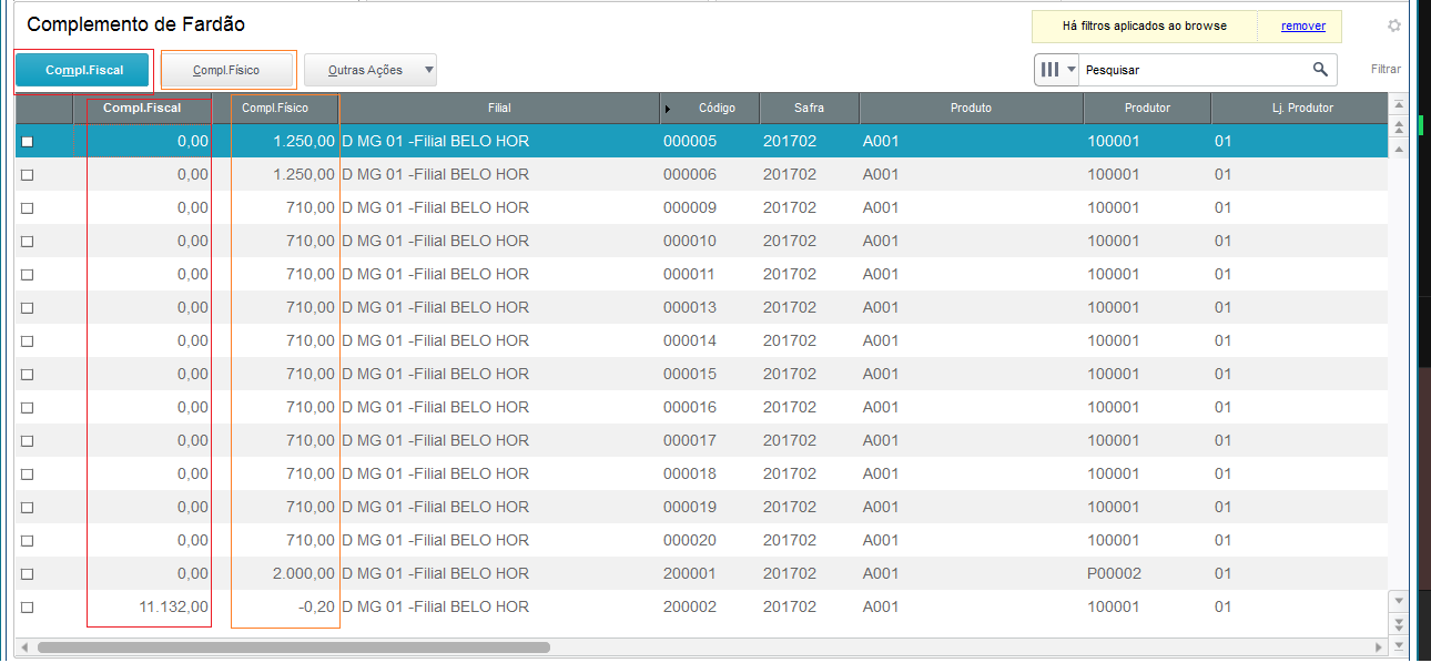 Para comportar a nova necessidade, a tela de Complemento de Fardão foi remodelada e passou a contar com um botão para o acionamento do Complemento Fiscal e outro para o Complemento Físico, salientando que as diferenças também são apresentadas em colunas separadas.