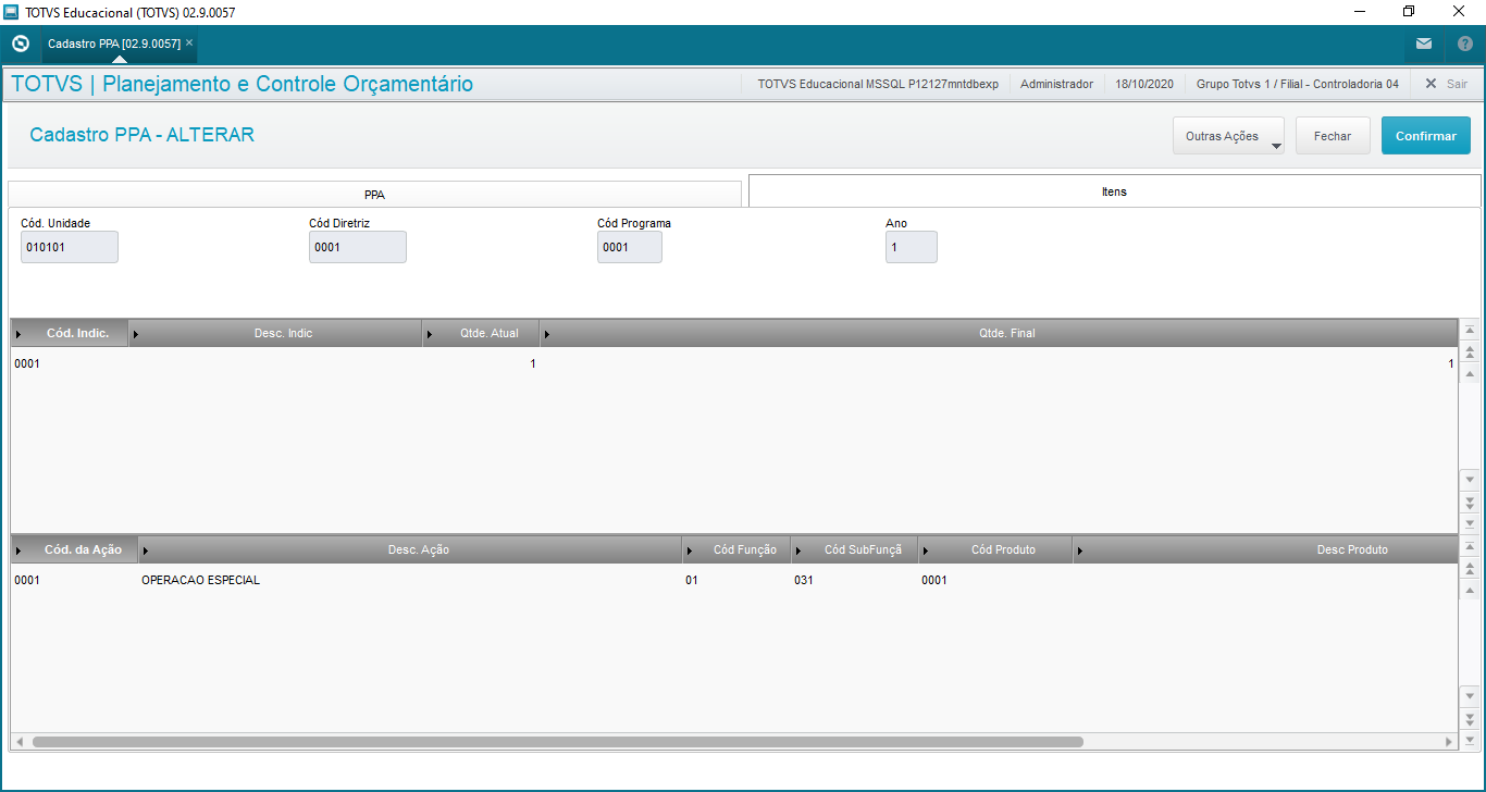 | AK0_VERSAO | Versão | Informa a versão do PPA para o código. Campo preenchido automaticamente pelo sistema. |