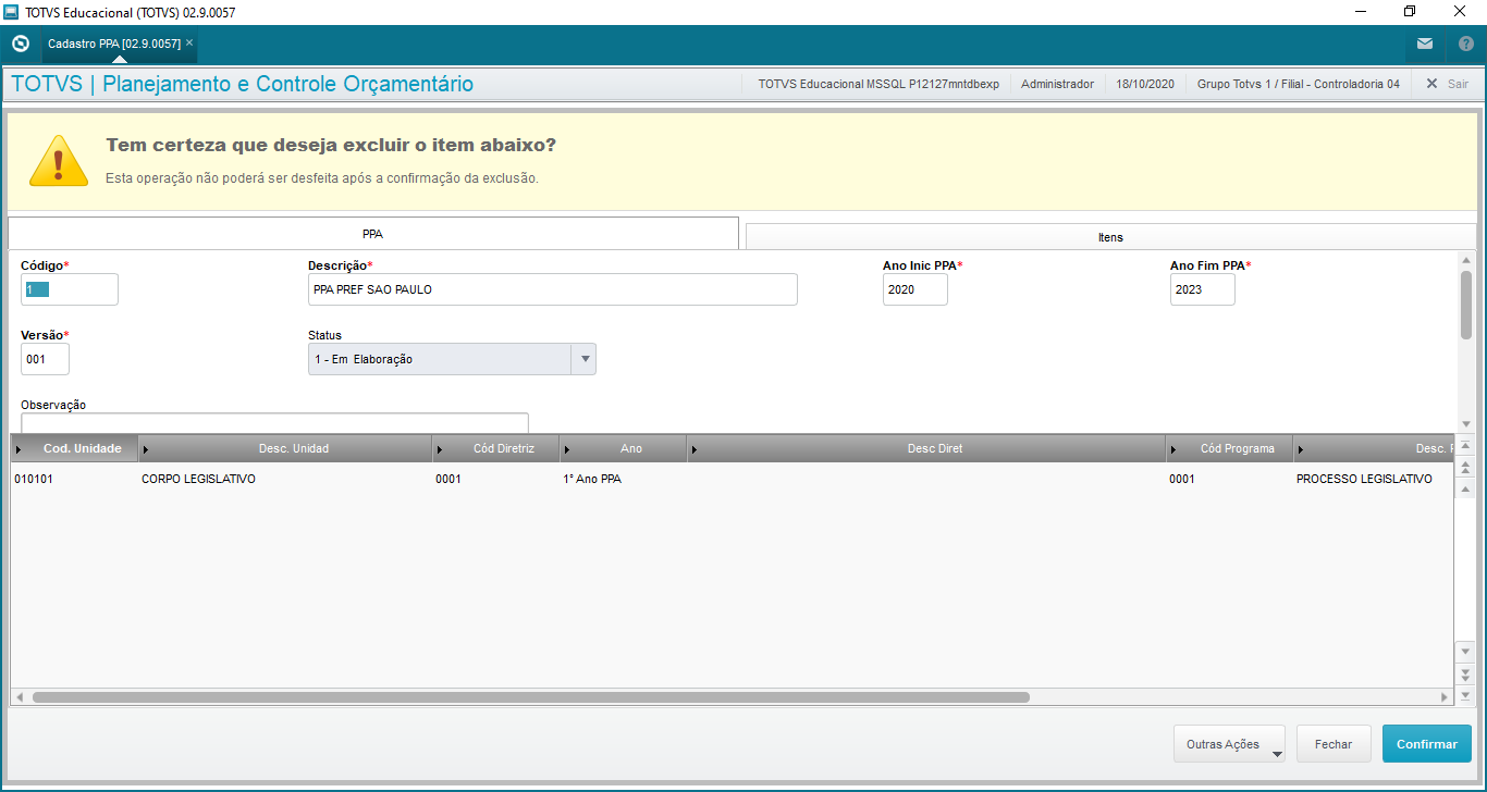 Exclusão - O usuário poderá realizar a exclusão do PPA