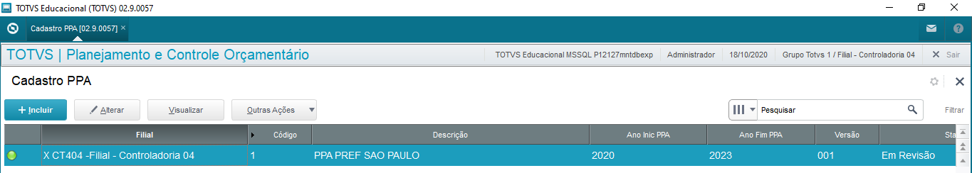 Se tentar alterar PPA em outro status será apresentada a mensagem de erro e a tela de alteração não será exibida.