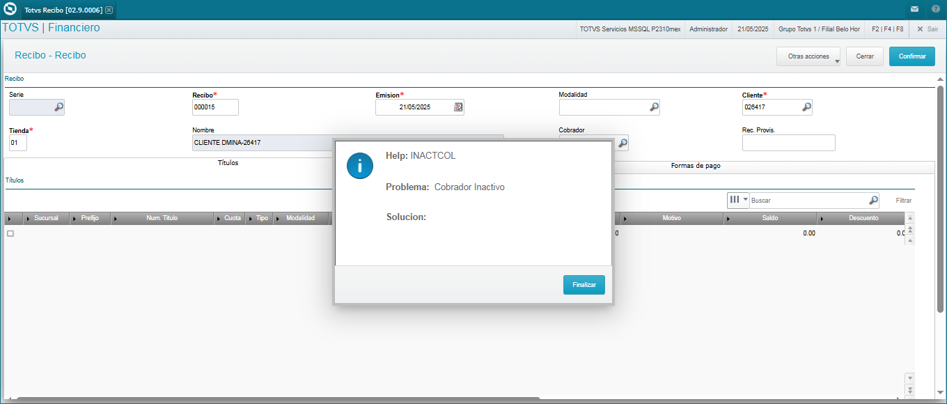 Desde la rutina TOTVS Recibo (FINA998), al seleccionar un Cobrador cuyo estatus es "Inactivo", se envía mensaje al usuario. A continuación, se muestra un ejemplo.