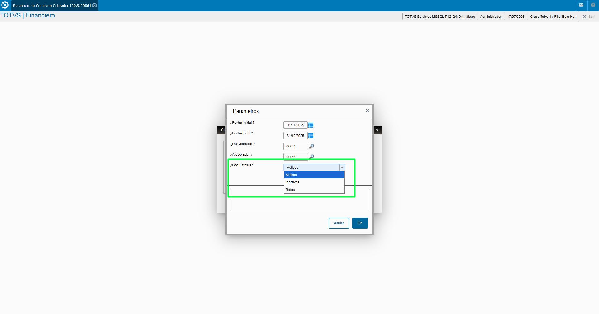 Para efectuar él recalculó del Cobrar, en el módulo Financiero (SIGAFIN), desde el menú Actualizaciones | Archivos, debe de ingresar a la rutina Recalculo Comisiones Cobradores (FINA016), en la sección de "Parámetros" puede localizar la pregunta "¿Con Estatus?", la cual tiene las 3 opciones "1-Activos, 2-Inactivos o 3-Todos", esta pregunta permite ejecutar un filtrado por estatus del cobrar, donde solo serán actualizados los Cobradores que tengan dicho estatus. Para más información de esta pregunta puede consultar el documento técnico: DT Recalculo de comisiones de cobradores utilizando el estatus MI