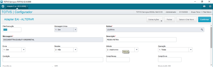No Configurador (SIGACFG), em Ambientes / Schedule / Schedule (CFGA010), efetue o cadastro da nova mensagem: DOCUMENTTRACEABILITYORDERRETAIL, rotina LOJI701A.
