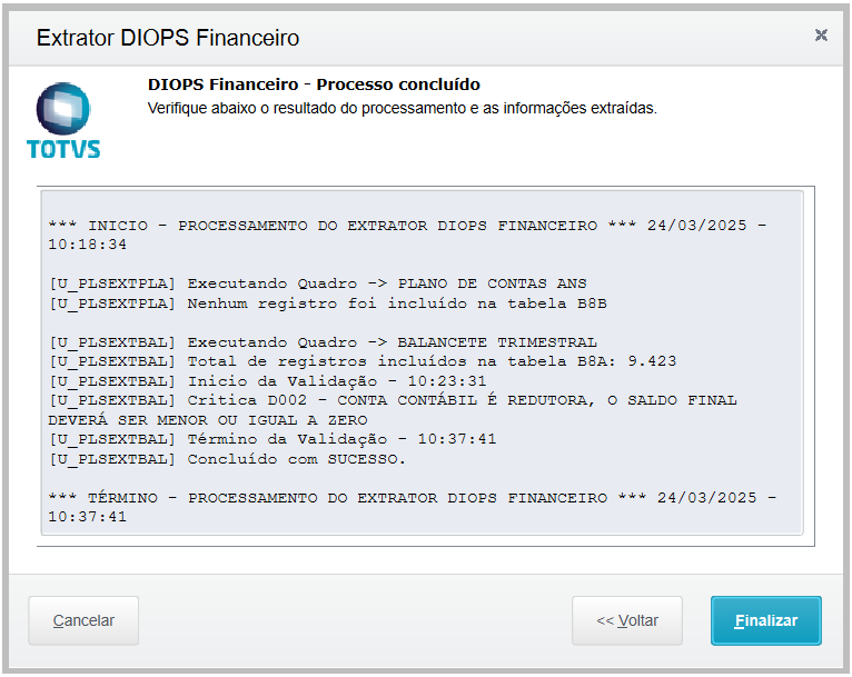 - Após o processamento, será apresentado uma tela com o log de execução dos extratores. Clique em Finalizar para sair da tela.