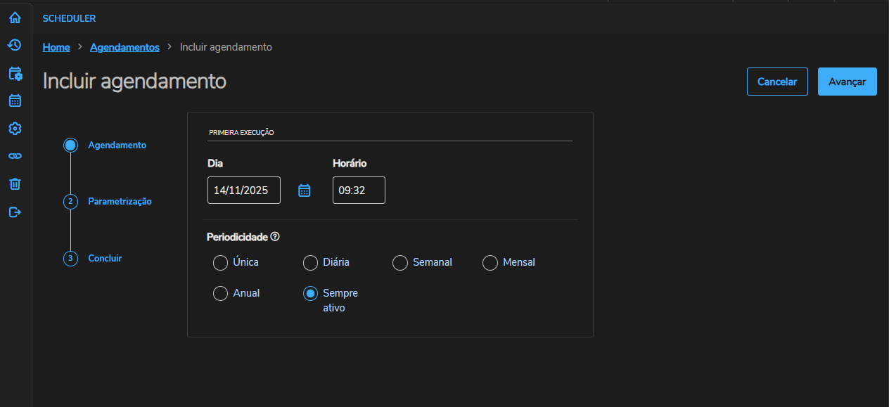 3.1 - Ao avançar deve ser configurado o dia/horário de início do agendamento e a periodicidade de execução do agendamento, conforme a necessidade da execução da Geração dos Indicadores.
