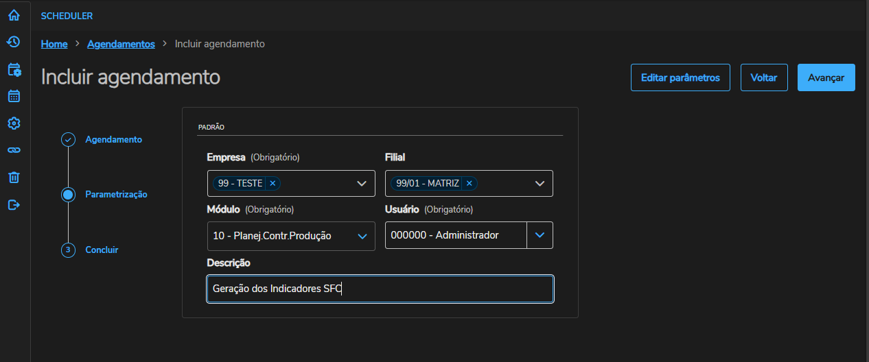 3.2 Na próxima tela informe os demais parâmetros (Empresa, filial, módulo, usuário e descrição para execução).