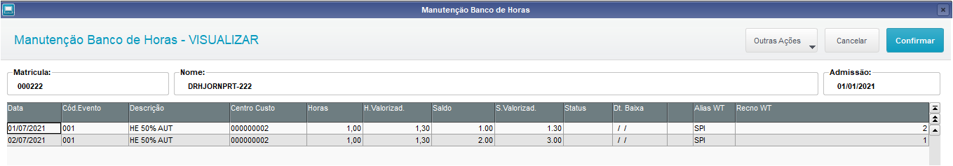 No total temos 2 duas horas extras realizadas pelo funcionário e foi gerado o Saldo Valorizado no total de 3 Horas (2h x 150% = 3).