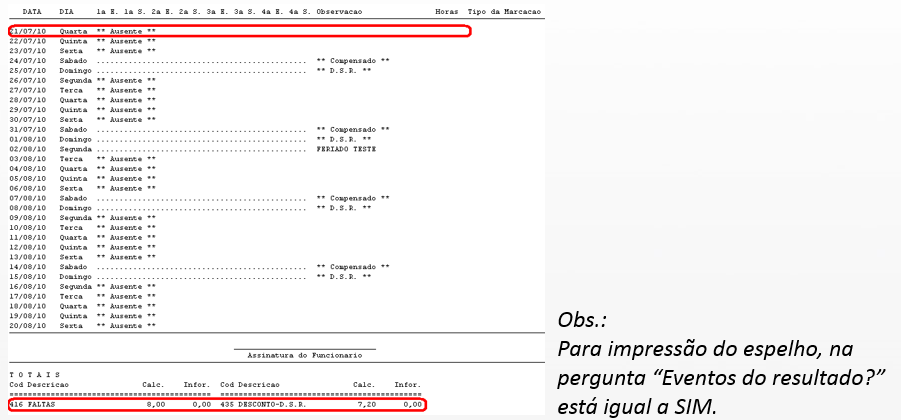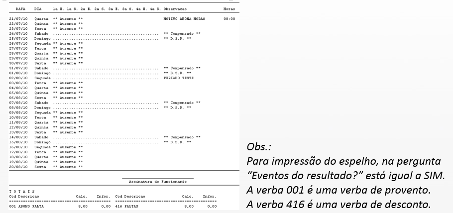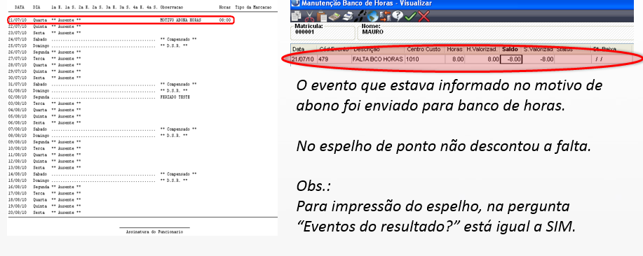 Após o calculo mensal e impressão do espelho, não irá aparecer a falta e, o evento associado do motivo de abono utilizado na falta, vai para banco de horas. |