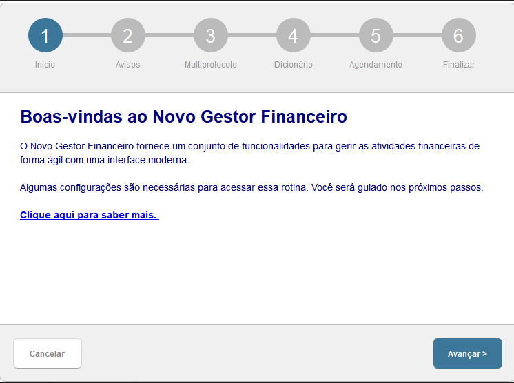 Nesse passo serão apresentadas as informações gerais do Novo Gestor Financeiro.
