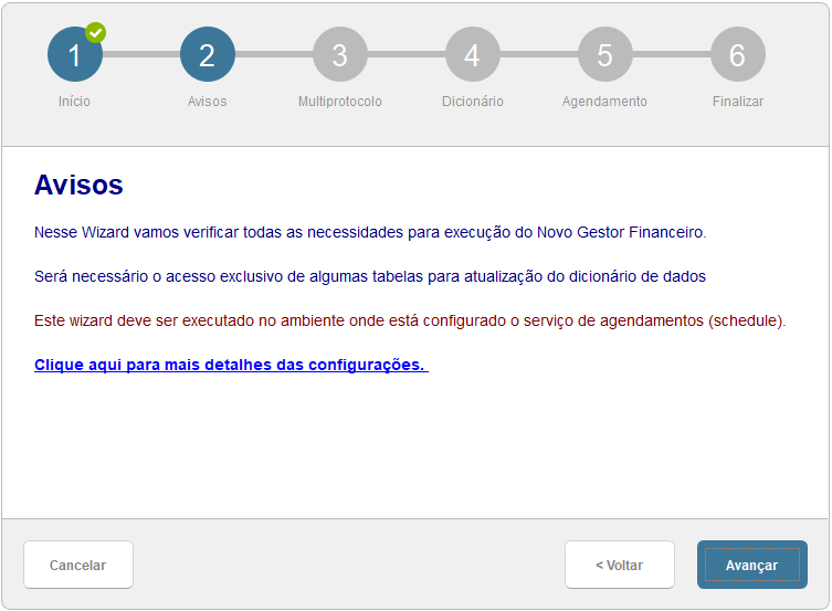 O Wizard será apresentado quando não for localizado o job FINA711 configurado no schedule do módulo configurador do ambiente ou não existir o campo S_T_A_M_P_ nas tabelas em uso do Novo Gestor Financeiro.