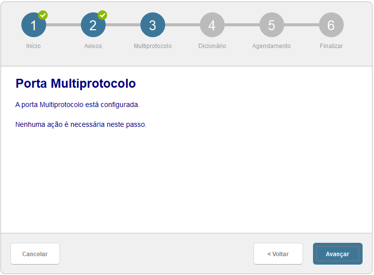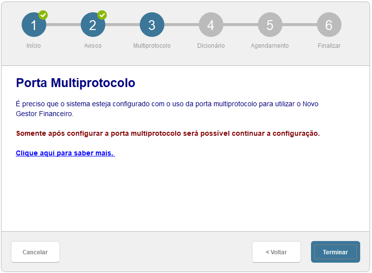 Após configurada a porta multiprotocolo e acessar novamente no Novo Gestor Financeiro é possível avançar para o próximo passo.