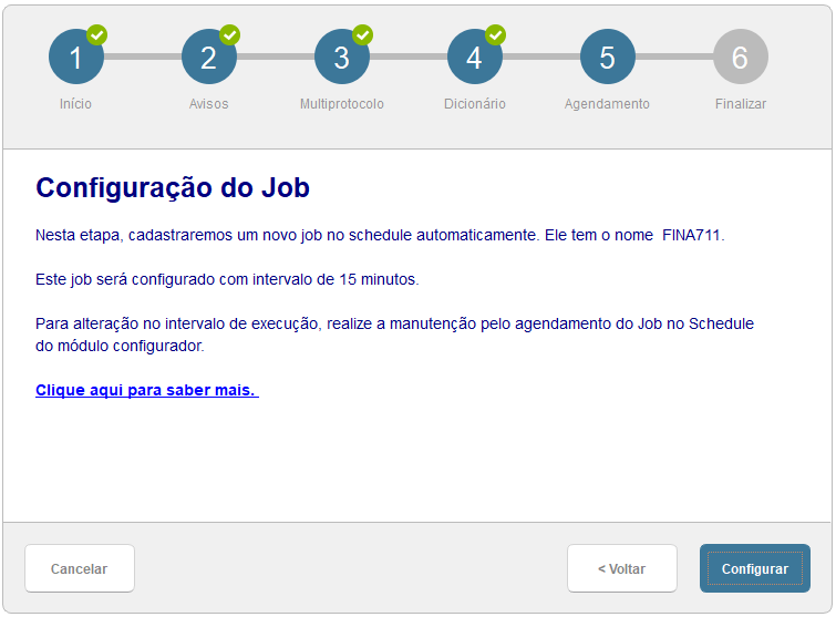 O Job é cadastrado automaticamente na execução do Wizard. Para execução do Job é preciso um agente ativo no schedule do módulo configurador: