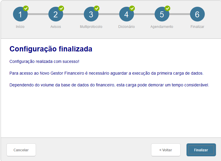 Nesse passo, todos os processos necessários para a execução do Novo Gestor Financeiro já estarão configurados.