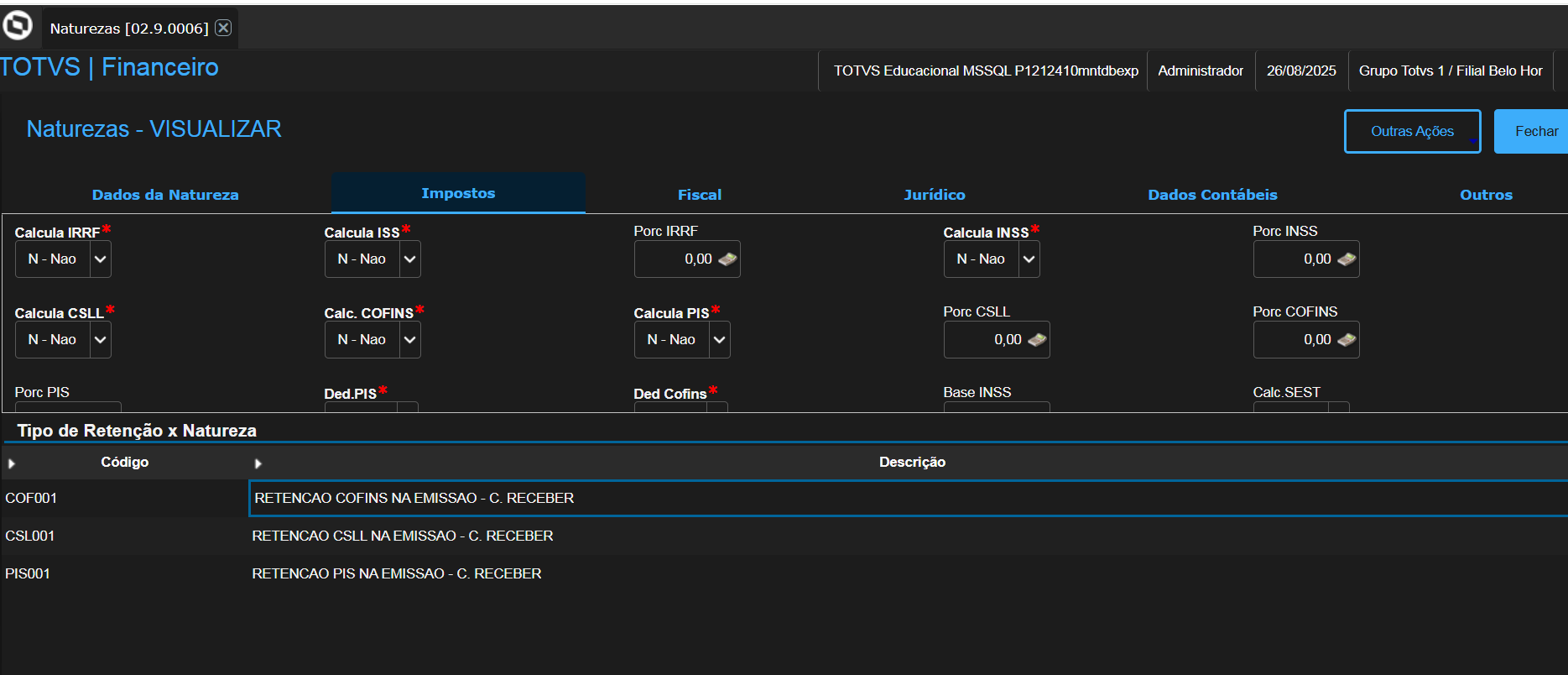 - Para a geração da cumulatividade em títulos avulso (direto do módulo Financeiro), faltará também vincular essas regras ao cadastro de Natureza e de Cliente / Fornecedor (conforma a carteira de título). Dessa forma, o cadastro de natureza ficaria assim: