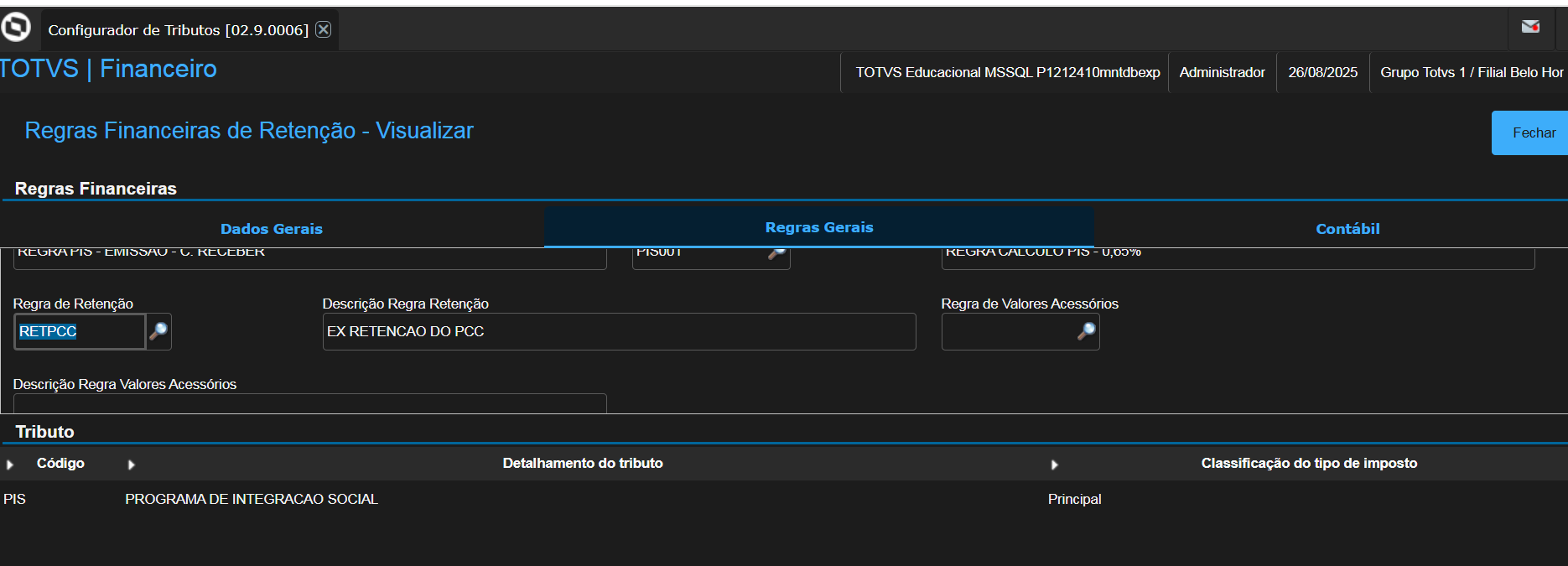 - No cadastro de Regra Financeira, atrelar essa regra de Retenção que será utilizada com a regra de cumulatividade. Assim: