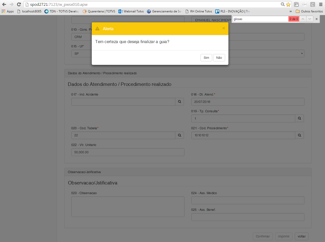 Tela onde informamos se queremos ou não finalizar a guia. Caso seja escolhido Sim, o sistema irá realizar a Mudança de Fase da Guia.