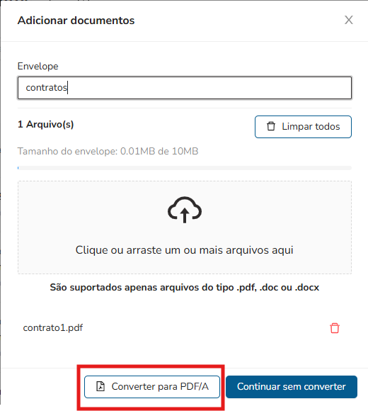 E para limpar todos os filtros de busca e voltar ao estado inicial da listagem de documentos, basta clicar no botão "Limpar'.