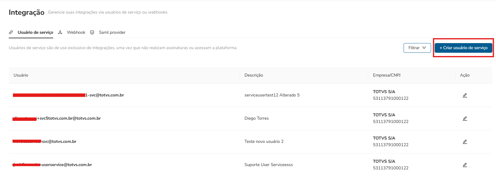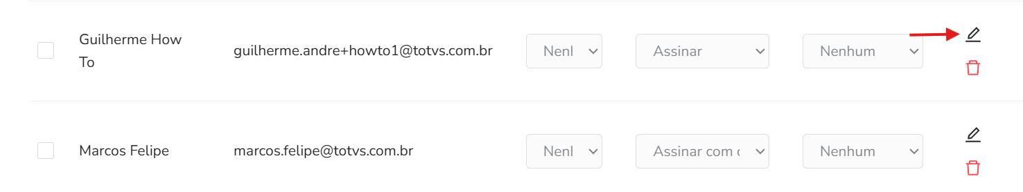 Os resultados da busca são listados em uma tabela e o administrador pode realizar ações como editar usuários e suas permissões ou até mesmo removê-lo da sua empresa no TOTVS Assinatura Eletrônica.