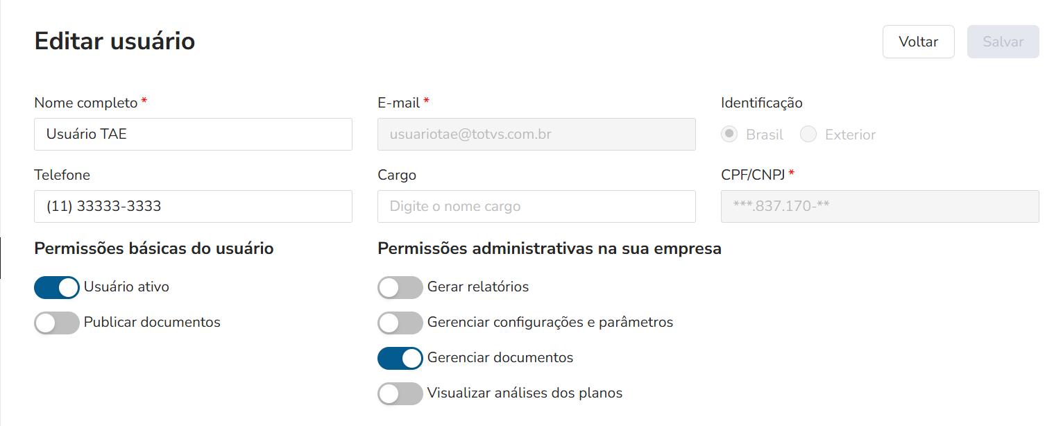 Nessa tela vemos que a identificação do usuário estas anonimizada, este comportamento pode ser controlado através do parâmetro da empresa, Anonimizar documentos de identificação na gestão de usuários, que pode ser encontrado no menu de configurações da empresa.