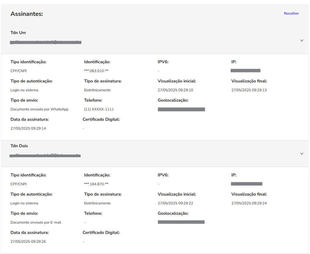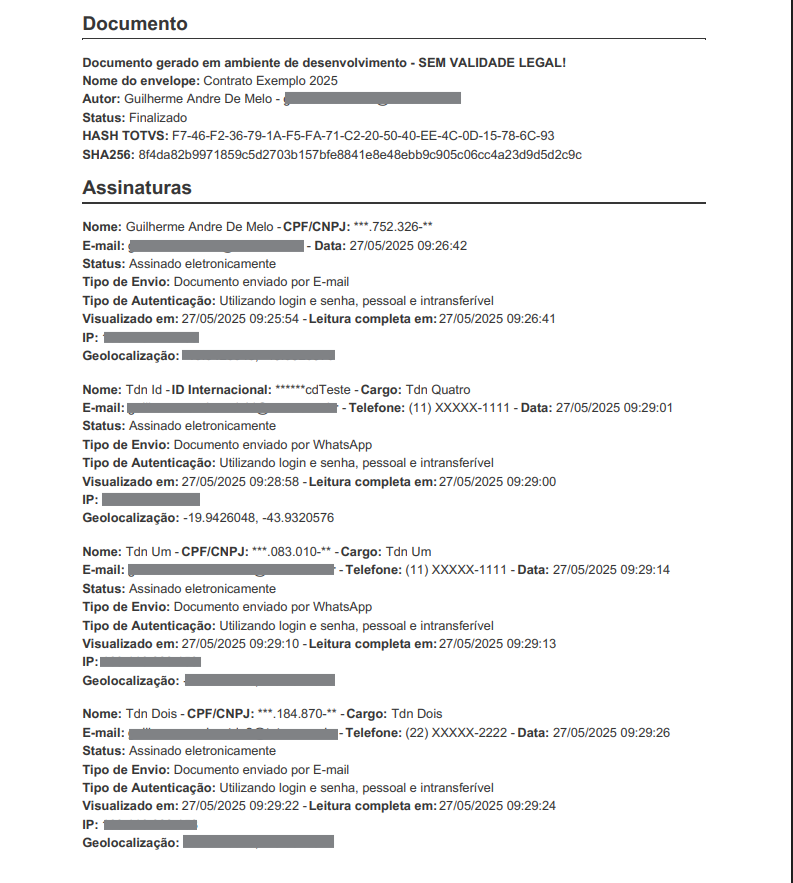 Caso o documento utilize assinaturas manuscritas, após os dados dos assinantes seram exibidas as assinaturas manuscritas e rubricas.