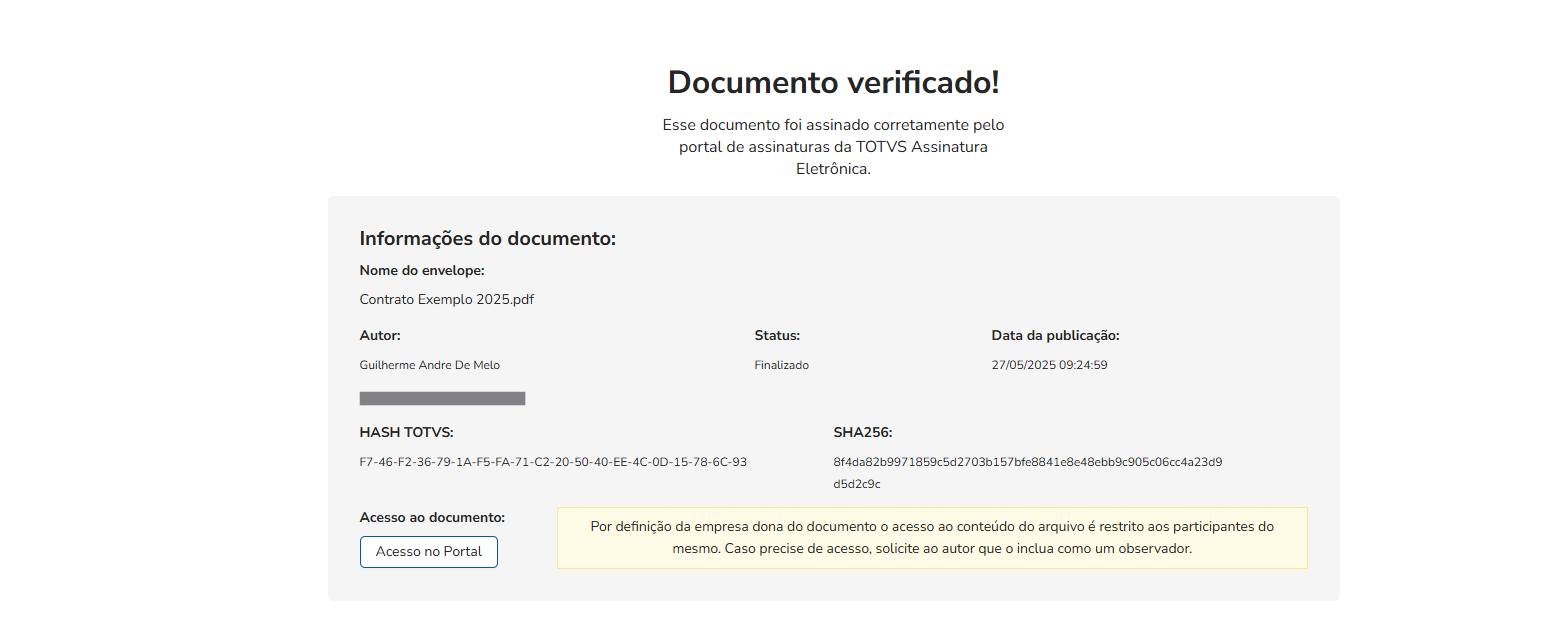 Nesta parte você tem o nome do envelope, o nome e e-mail do autor, o status do documento, a sua data de publicação, o Hash (o mesmo usado no verificador), o Hash sha256 e o link do documento na plataforma. Sendo possível também acessar o documento no portal ou fazer o download do mesmo, funcionalidade essa parametrizada pelo administrador do portal.