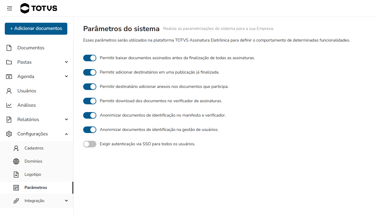 Para adquirir pacotes de documentos do TOTVS ASSINATURA ELETRÔNICA utilize a TOTVS STORE.
