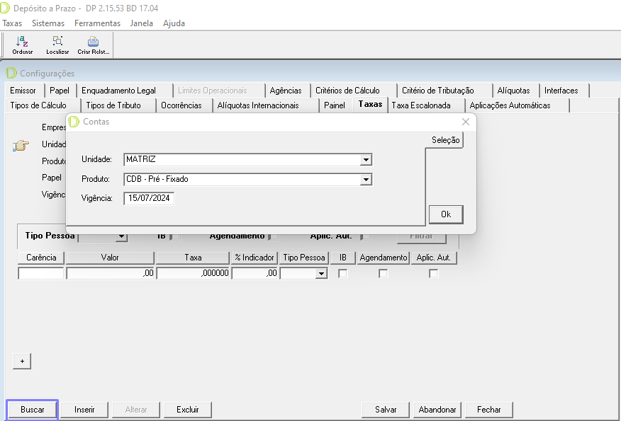 Para incluir uma nova taxa, Acessar o sistema DP > Configuração > Taxa, buscar o produto desejado;