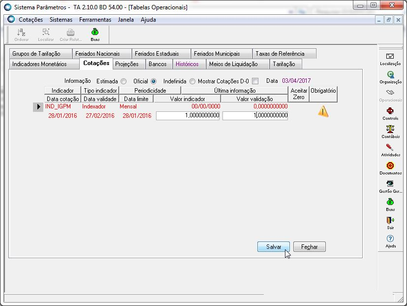 - Digite a cotação inicial para o índice IGPM. Recomentamos a utilização do valor 1,0000000000 para o primeiro registro. Após informa-lo, clique sobre o botão Salvar.