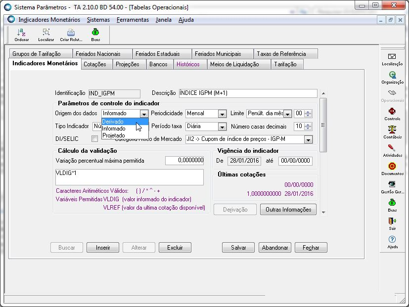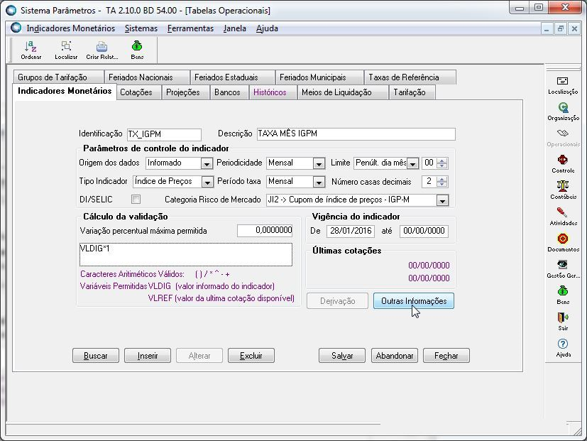 . Na janela Tabelas operacionais, cadastre o Índice IGPM, preenchendo os campos conforme o indicado: