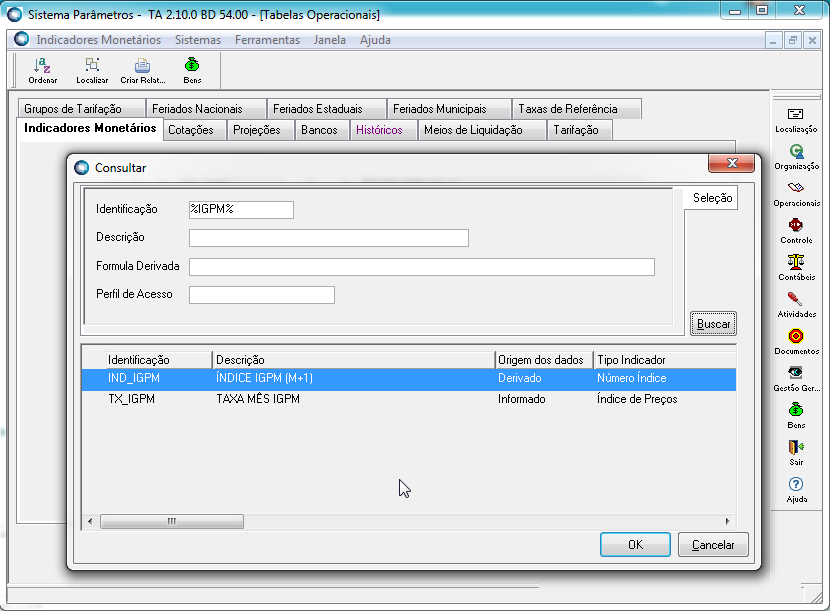 - Clique sobre o botão Buscar e localize o Indicador IGPM, cadastrado nos passos anteriores.