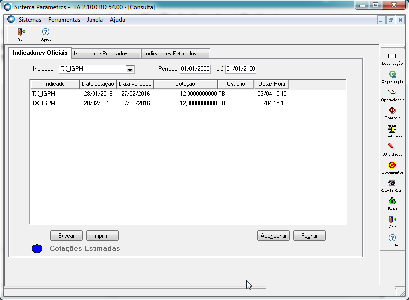 - A taxa IGPM está configurada e apta para cadastro. Clique sobre a aba Cotações para realizar os registros.