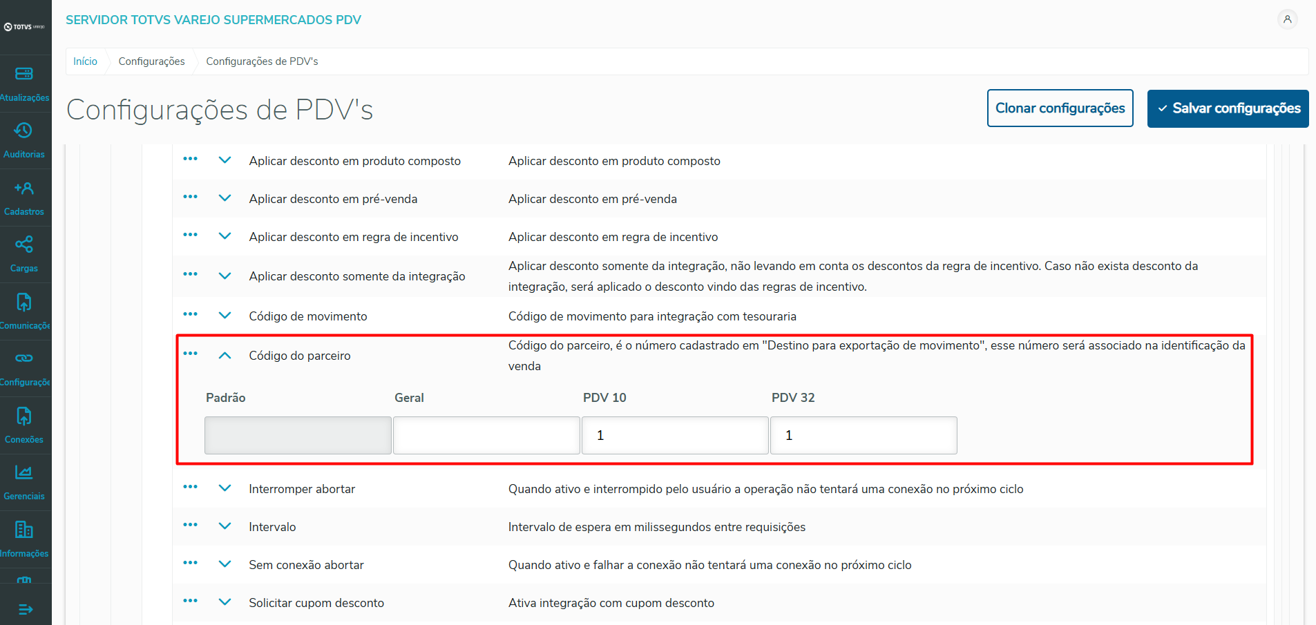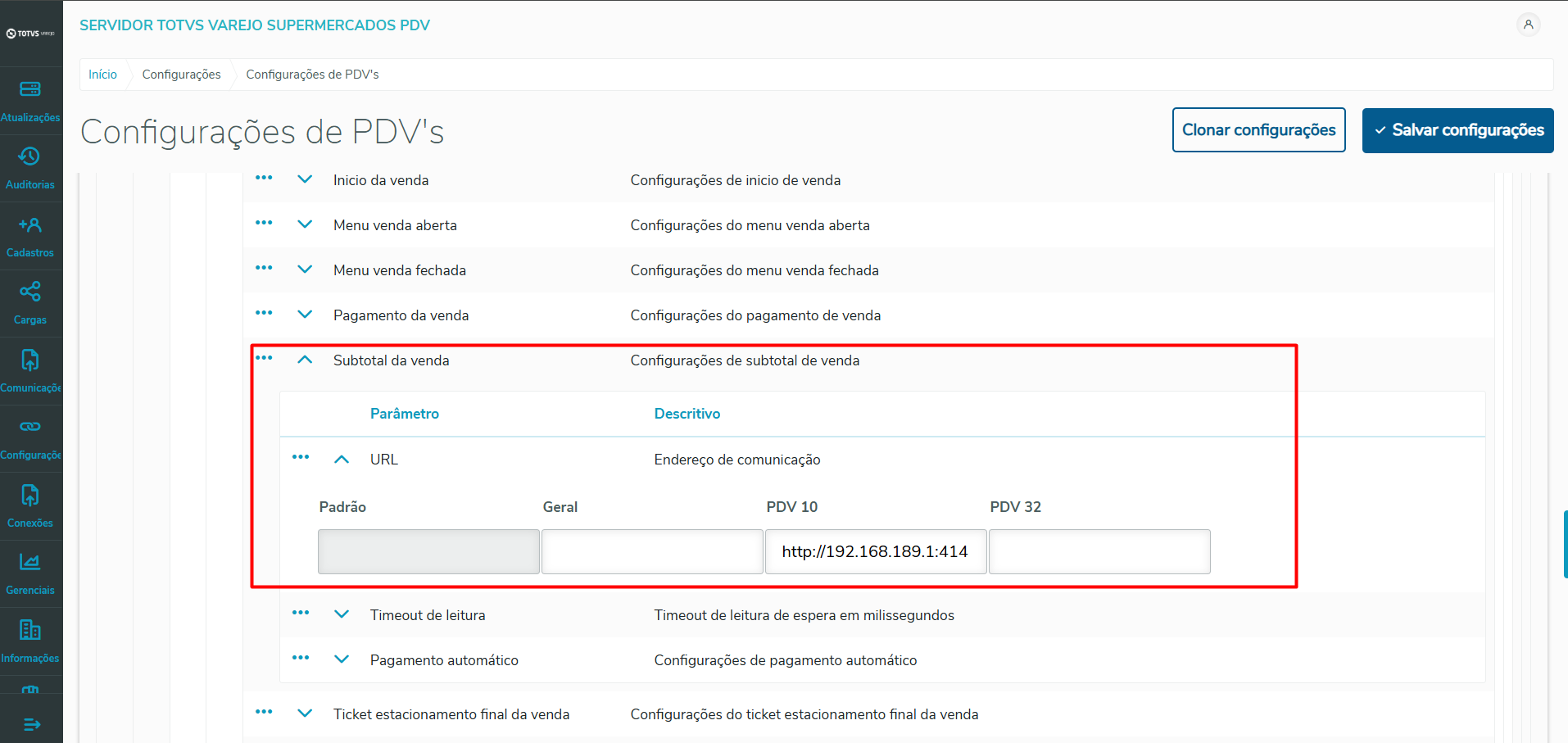 Imagem 1 - Tela de configurações de PDVs.